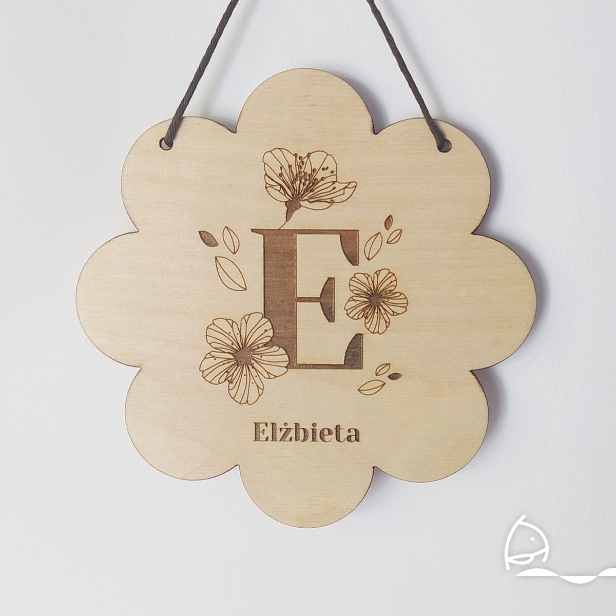 Tabliczka z inicjałem w kształcie kwiatka to dekoracja pasująca do pokoju małej dziewczynki. Ozdoba zawiera także imię dziecka, subtelna kwiatowa ilustracja dopełnia intensywny grawer literki.